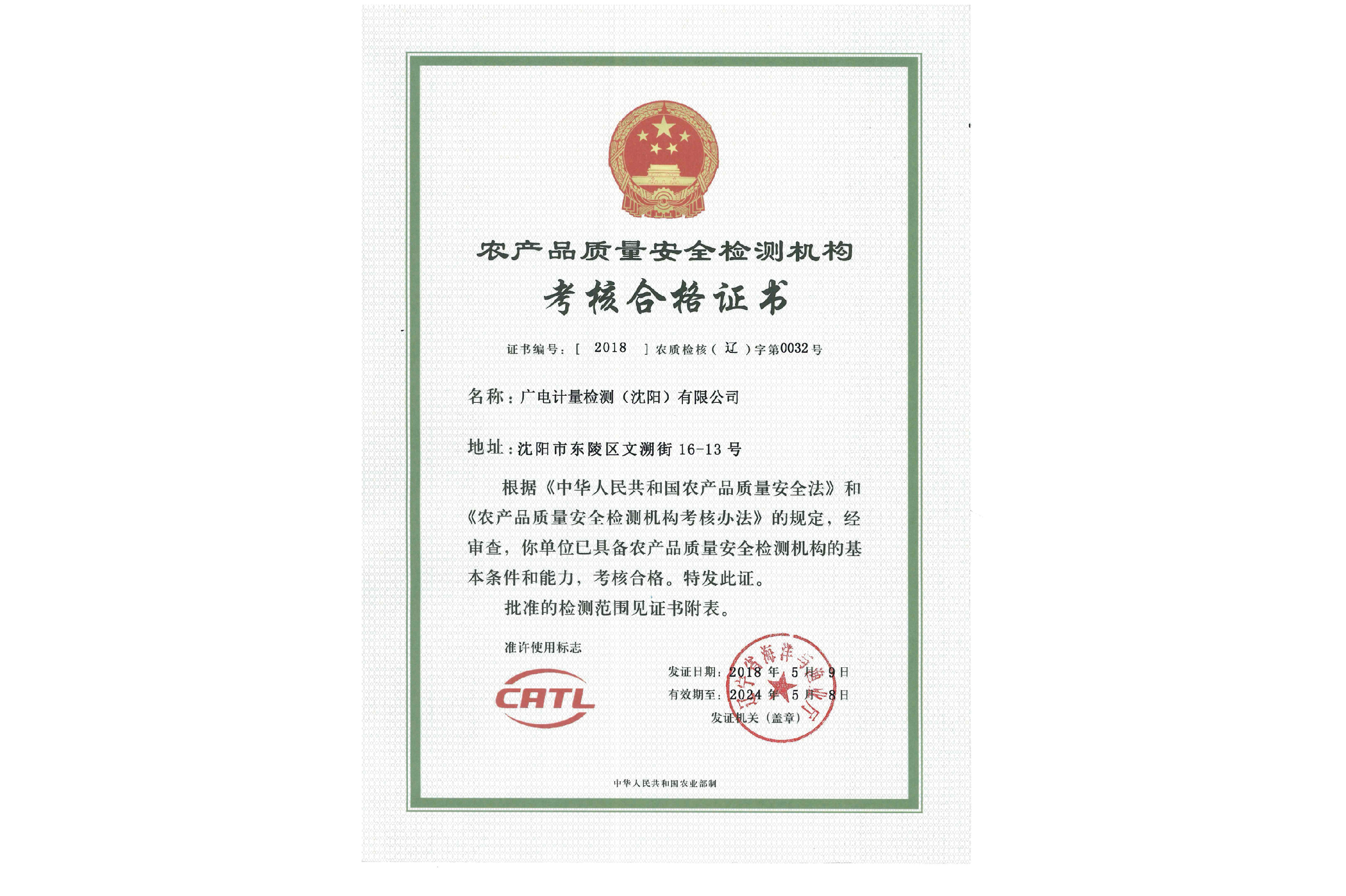 農(nóng)產(chǎn)品質(zhì)量安全檢測機(jī)構(gòu)(CATL)合格證書-廣電計(jì)量(沈陽 )有限公司-水產(chǎn)品