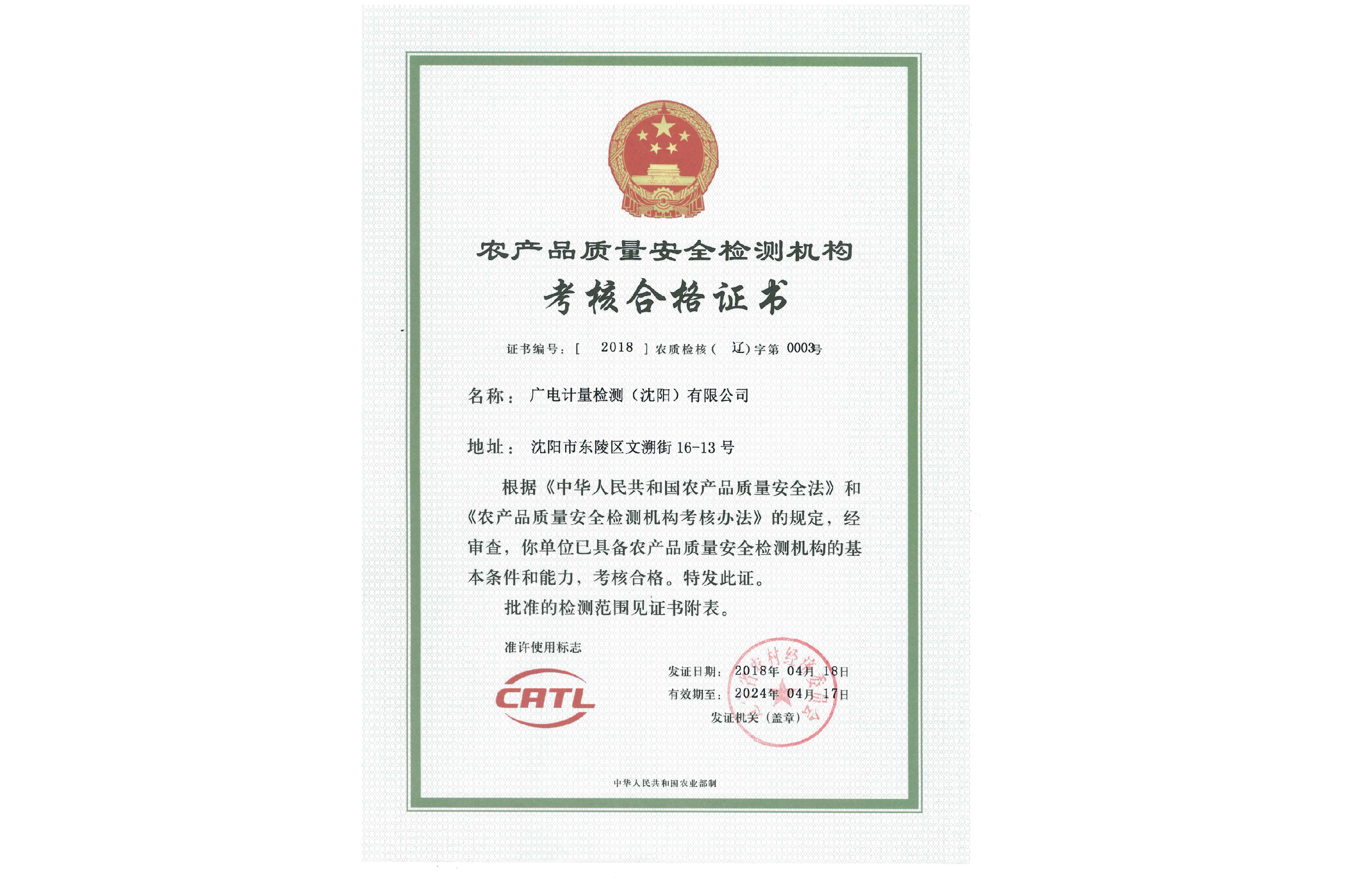 農產品質量安全檢測機構(CATL)合格證書-廣電計量(沈陽 )有限公司