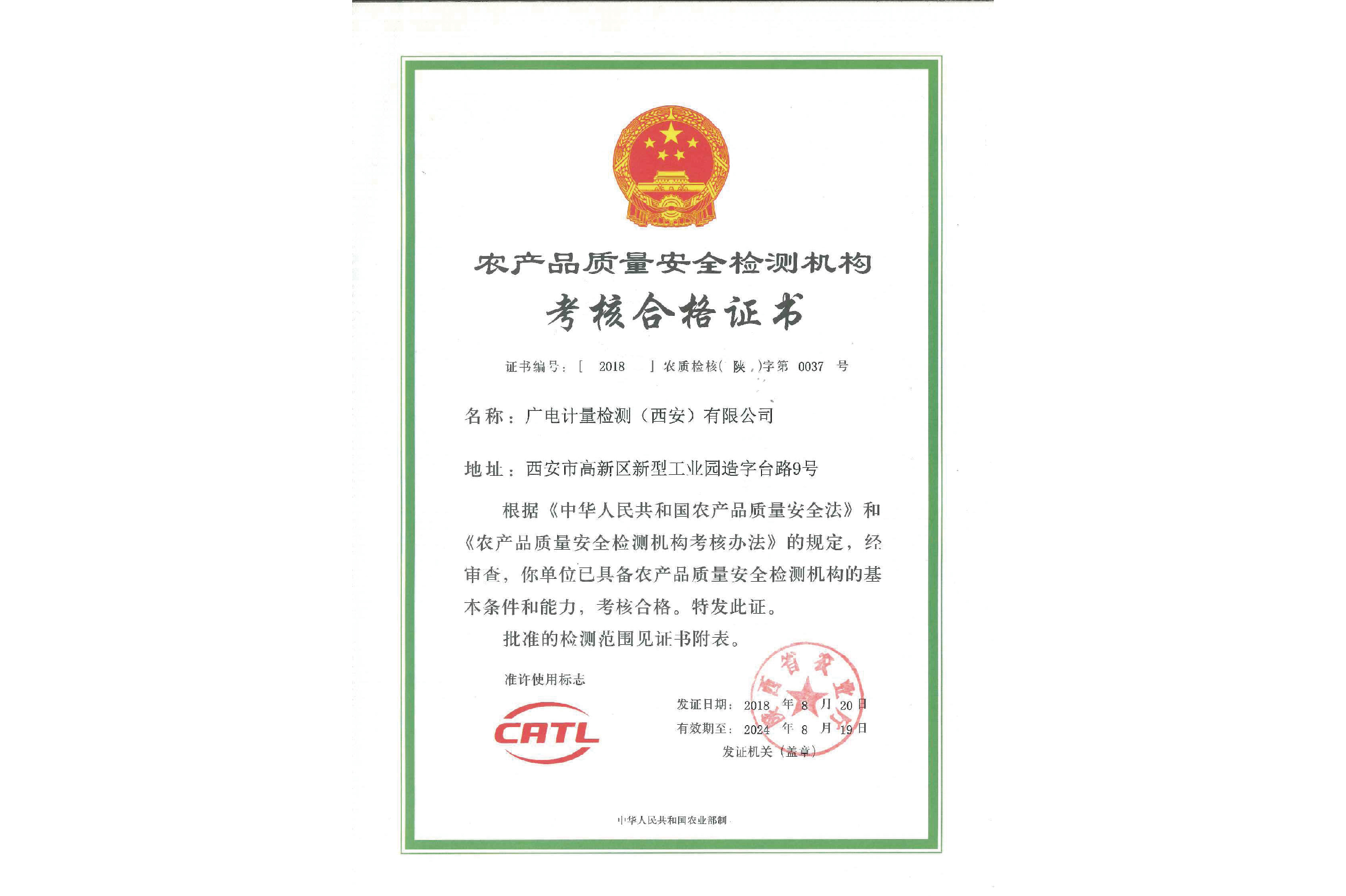農產品質量安全檢測機構(CATL)合格證書-廣電計量(西安)有限公司