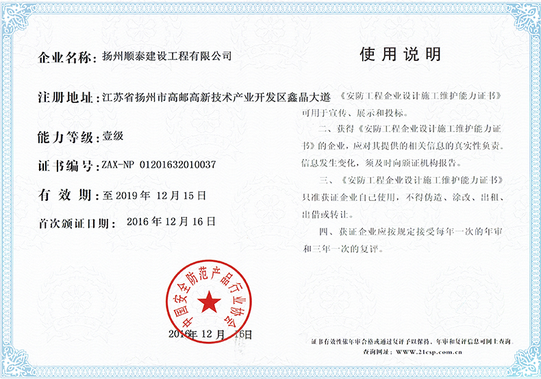 安防工程企業設計施工證書-順泰交通