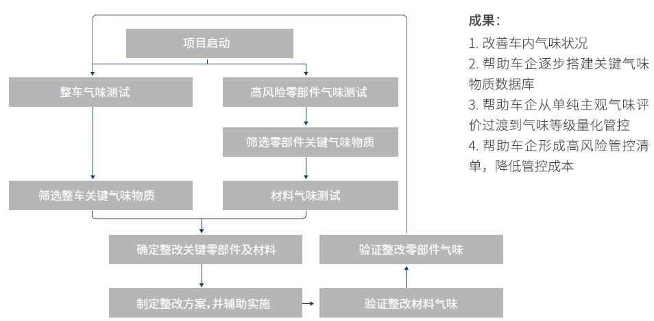 通過對整車的分層溯源(整車/零部件/材料),識別目標物質,制定管控清單,并進行整改驗證。分析除8種管控物質外的前25種最大揮發性有機物及醛酮類物質,協助企業提前防范后續有可能增加的揮發性有機物管控要求,釋放未來的管控壓力。