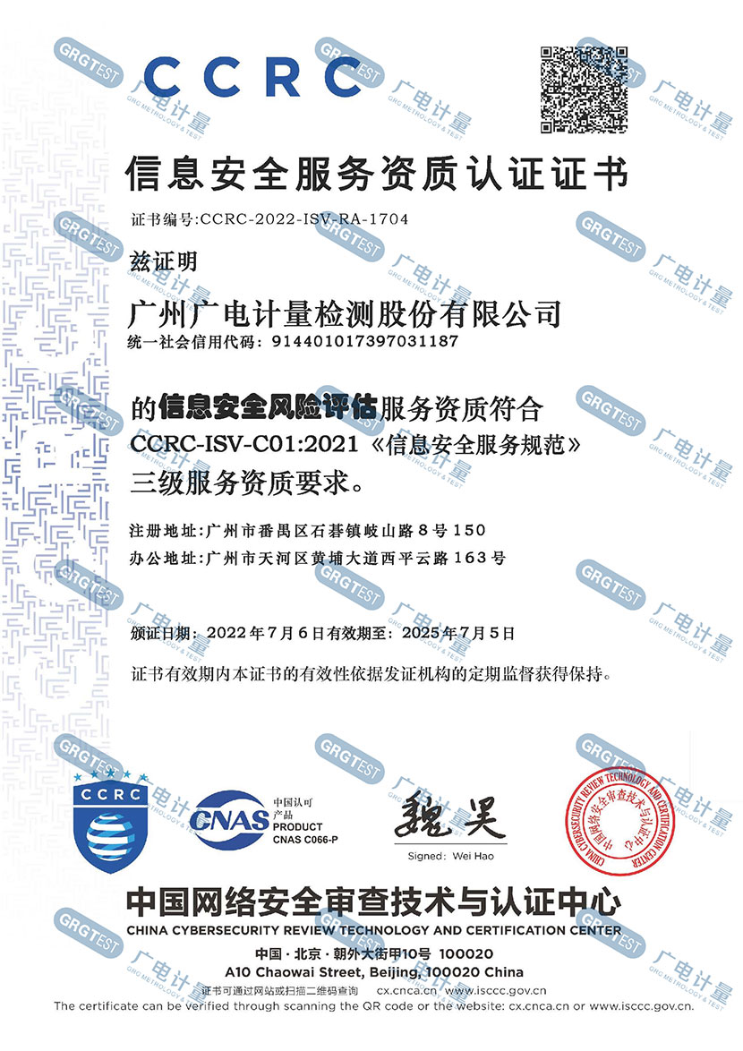 (1)廣電計量獲得中國網絡安全審查技術與認證中心(CCRC)頒發的信息安全服務資質認證證書;