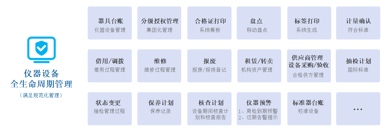 產品概述:實現儀器設備全生命周期管理,符合國家CNAS/17025管理要求,使儀器設備在計量管理方面進行符合計量規范、科學化管理,最大化發揮設備的價值,提高儀器設備的經濟效益和使用效率。
