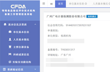 廣電計量廣州食品檢測實驗室順利通過了國家食品藥品監督管理總局特殊食品驗證評價技術機構備案(備案編號:TY03051317)