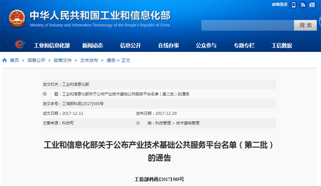 工業(yè)和信息化部關(guān)于公布產(chǎn)業(yè)技術(shù)基礎(chǔ)公共服務(wù)平臺名單(第二批)的通告