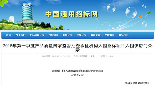 2017年12月21日,方圓廣電檢驗(yàn)檢測(cè)股份有限公司(簡(jiǎn)稱“方廣檢測(cè)”)列入了“2018年第一季度產(chǎn)品質(zhì)量國(guó)家監(jiān)督抽查承檢機(jī)構(gòu)入圍招標(biāo)項(xiàng)目”入圍供應(yīng)商。
