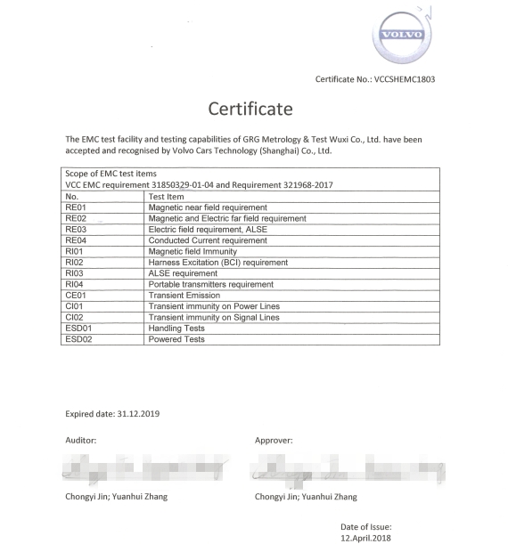 日前,廣電計量上海可靠性與環境試驗實驗室、無錫電磁兼容檢測實驗室先后成為沃爾沃汽車技術(上海)有限公司(以下簡稱“沃爾沃”)授權認可的第三方實驗室,認可范圍覆蓋電磁兼容測試、高分子材料試驗、表面材料和循環腐蝕試驗等各大類別。此前,廣電計量無錫子公司還順利獲得了眾泰汽車ELV檢測的第三方實驗室認可。廣電計量頻頻獲得國內外知名汽車制造商授予的檢測資質,充分表明了合作伙伴對廣電計量技術能力、實驗設備、人才團隊、質量管控等全方位綜合實力的肯定,為后續展開深入合作打下了重要基礎。