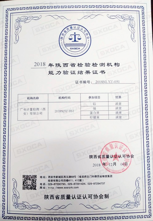 西安廣電計(jì)量獲頒2018年陜西省檢驗(yàn)檢測(cè)機(jī)構(gòu)能力驗(yàn)證結(jié)果證書