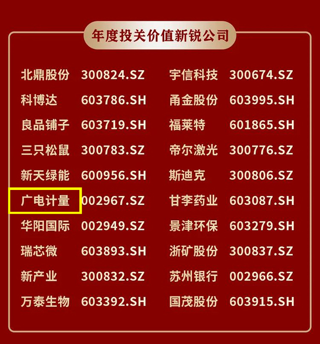 12月8日,由中國基金報聯合權威投關平臺機會寶共同舉辦的首屆中國上市公司投關價值經綸獎評選榜單揭曉。憑借在公司治理、信息披露和投資者關系管理等工作方面的優異表現,廣電計量榮膺“年度投關價值新銳公司”。