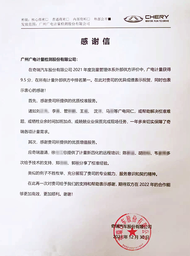 近日,廣電計(jì)量在奇瑞汽車股份有限公司(簡(jiǎn)稱奇瑞汽車)2021年度測(cè)量管理體系外部供方評(píng)定中獲得總分第一名。奇瑞汽車發(fā)來(lái)感謝信,對(duì)廣電計(jì)量的專業(yè)技術(shù)能力、服務(wù)水平、契約精神給予高度認(rèn)可。
