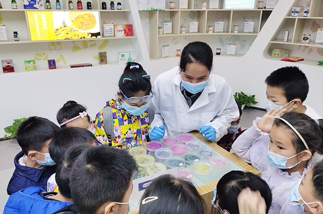 細菌長什么樣?通過觀看顏色、外觀各異的細菌培養(yǎng)皿,技術(shù)人員向?qū)W生強調(diào)要養(yǎng)成講衛(wèi)生的好習慣。