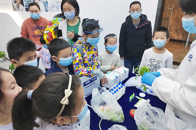 最后,小朋友們拿著提前從家里準備的蔬菜,交給技術(shù)人員進行快檢,確認蔬菜上的農(nóng)藥殘留是否達標。