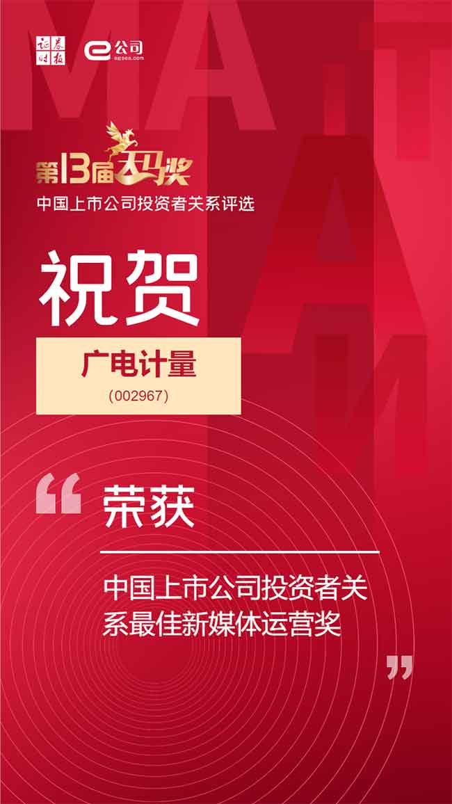 4月22日,由證券時報社主辦、e公司承辦的“穩中求進、篤定前行”第十三屆中國上市公司投資者關系“天馬獎”榜單正式揭曉。廣電計量(002967.SZ)憑借在投資者關系管理及新媒體運營方面的良好表現,榮獲“中國上市公司投資者關系最佳新媒體運營獎”,充分體現了監管部門和資本市場對公司信息披露、投資者關系管理工作的認可。
