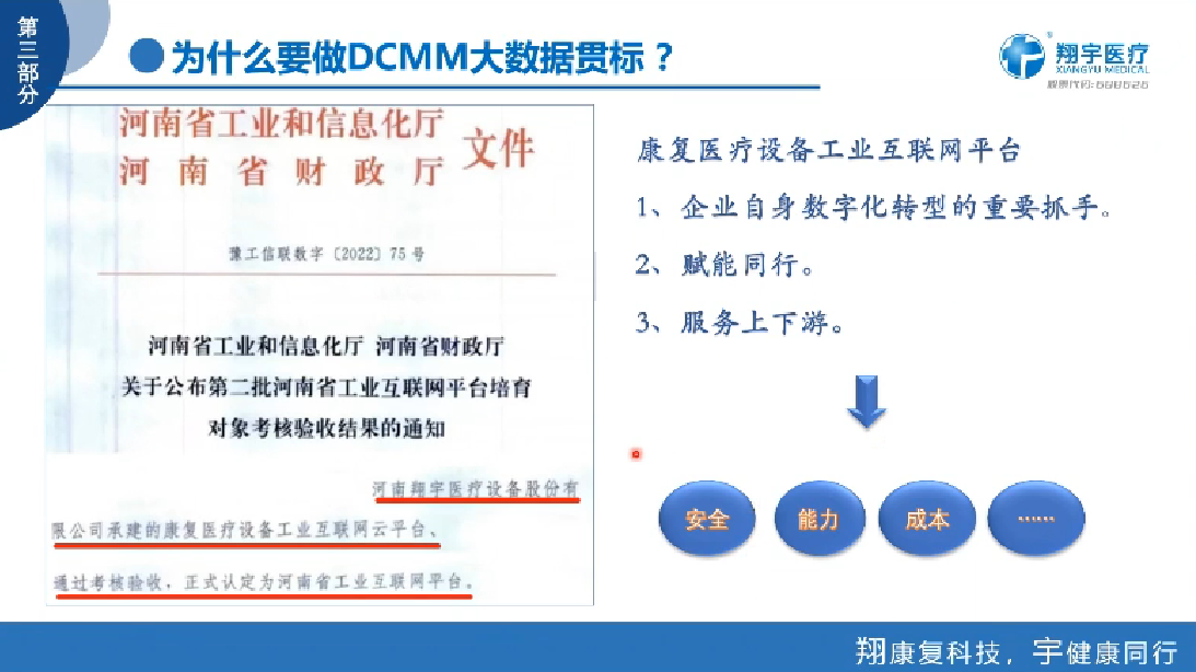 河南翔宇醫(yī)療設(shè)備股份有限公司信息中心總監(jiān)張偉在主題分享中表示,翔宇醫(yī)療今年被正式認定為河南省工業(yè)互聯(lián)網(wǎng)平臺,并基于此開展DCMM大數(shù)據(jù)貫標,提升數(shù)據(jù)管理能力,將有助于工業(yè)互聯(lián)網(wǎng)平臺建設(shè)和推廣,支撐康復(fù)醫(yī)療設(shè)備的互聯(lián)互通以及康復(fù)醫(yī)聯(lián)網(wǎng)、康復(fù)醫(yī)聯(lián)體的協(xié)同運作。