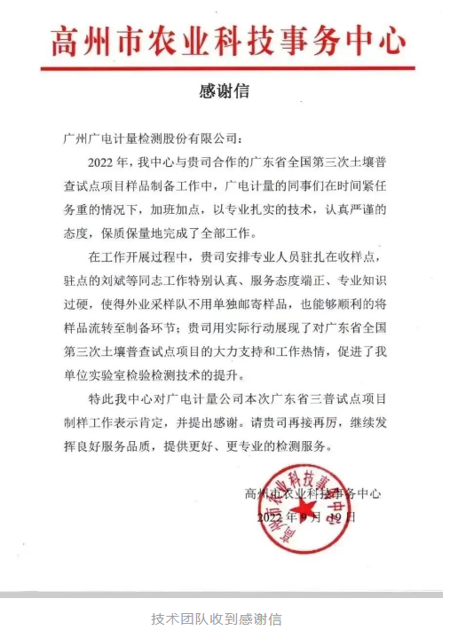 廣電計(jì)量已在廣州、長沙、鄭州、南寧、沈陽、成都、南昌、西安、合肥、福州、天津等11個(gè)地區(qū)建立生態(tài)環(huán)境檢測實(shí)驗(yàn)室,先后榮獲“南方耕地污染防控企業(yè)重點(diǎn)實(shí)驗(yàn)室”“全國土壤污染狀況詳查檢測實(shí)驗(yàn)室”“耕地質(zhì)量標(biāo)準(zhǔn)化驗(yàn)室”等項(xiàng)目承接資質(zhì)榮譽(yù);截至2022年7月11日,廣電計(jì)量已有10家實(shí)驗(yàn)室全部入圍《第三次全國土壤普查檢測實(shí)驗(yàn)室公示名單》;長沙、合肥實(shí)驗(yàn)室成功?圍本省第三次全國土壤普查外業(yè)調(diào)查與采樣單位名單。