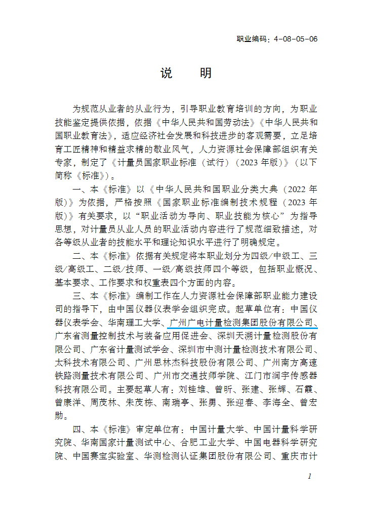 近日,人力資源社會(huì)保障部發(fā)文《人力資源社會(huì)保障部辦公廳關(guān)于頒布勞動(dòng)保障協(xié)理員等25個(gè)國(guó)家職業(yè)標(biāo)準(zhǔn)的通知》(人社廳發(fā)[2023] 32號(hào))。由廣電計(jì)量參與起草的《計(jì)量員國(guó)家職業(yè)技能標(biāo)準(zhǔn)》(以下簡(jiǎn)稱(chēng)《標(biāo)準(zhǔn)》)自公布之日起施行。