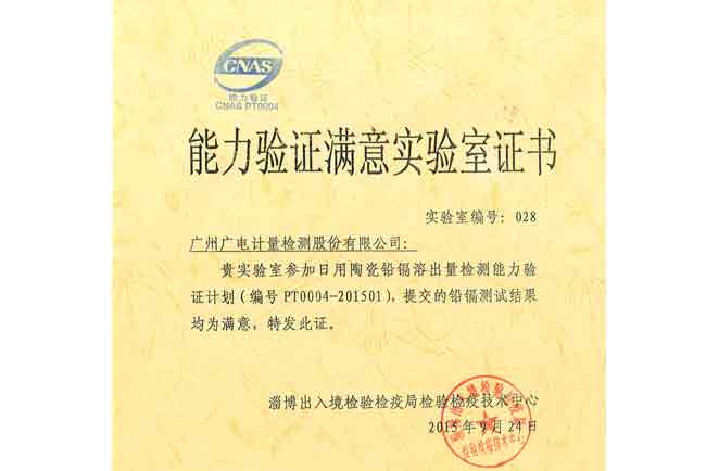 GRGT近期收到淄博出入境檢驗檢疫局檢驗檢疫技術中心關于“PT0004-201501 日用陶瓷鉛鎘溶出量檢測”能力驗證計劃結果滿意證書和報告,結果顯示GRGT化學分析測試中心檢測結果的Z比分數絕對值全部小于0.7,大于規定的小于2的要求,順利通過本次能力驗證。