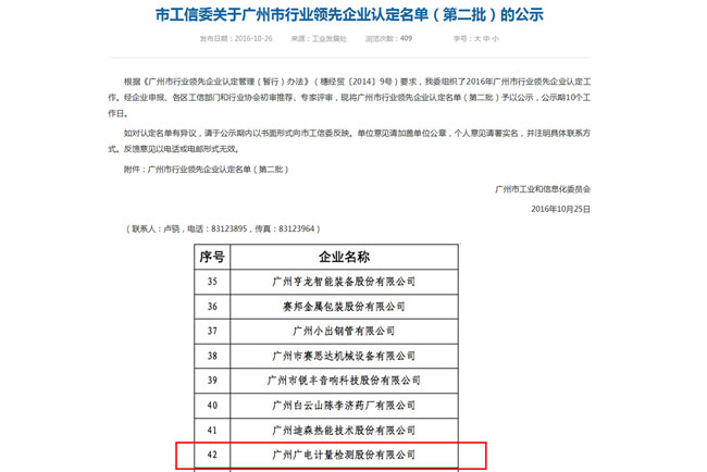 10月,根據(jù)《廣州市行業(yè)領先企業(yè)認定管理(暫行)辦法)》(穗經(jīng)貿[2014]9號)要求,經(jīng)廣州市工業(yè)和信息化委員會組織專家評審,廣電計量被認定為廣州市行業(yè)領先企業(yè)。