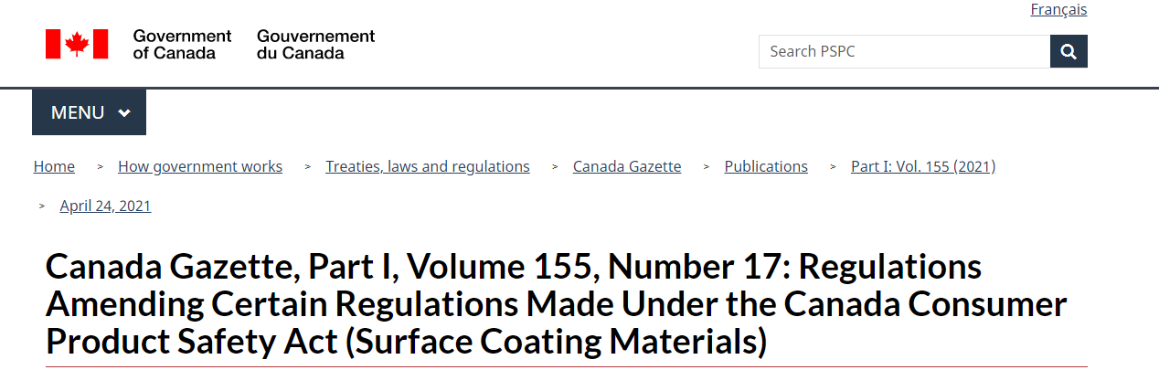 近日,加拿大衛(wèi)生部在官方公報(bào)(Canada Gazette)上發(fā)布加拿大消費(fèi)品安全法案(CCPSA)管控下的表面涂層材料法規(guī)(Surface Coating Materials Regulations)更新的提議,公眾評議期70天,于2021年7月3日結(jié)束。