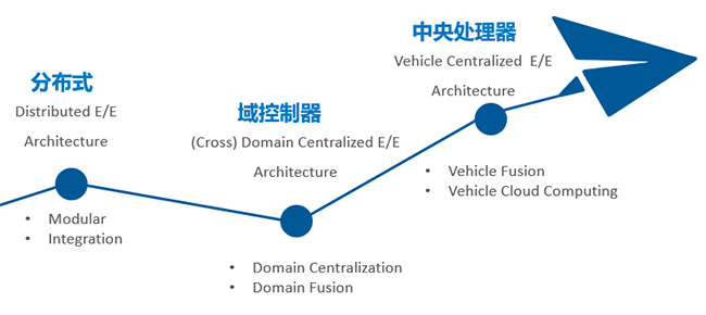 全球最大汽車零部件制造商博世認為,電子電氣架構將依次經歷傳統的分布式、域控制器、中央處理器三個階段的逐漸發展。從各個模塊相互獨立,到功能集成,再到域控制器,再到中央控制器,最終到達云計算。
