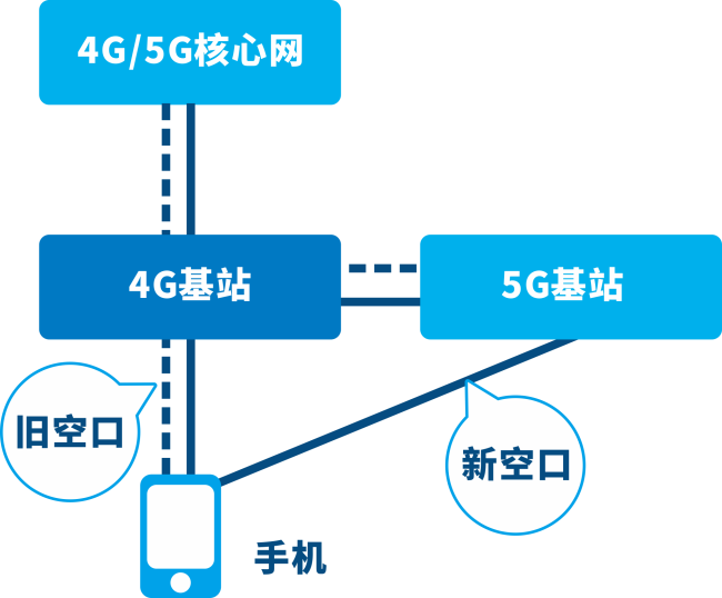 藍(lán)工:NR是New Radio的縮寫,也被稱為“新空口”。我們都知道,5G是非常靈活的,具體怎么靈活呢?它可以獨(dú)立組網(wǎng),也可以跟4G一起非獨(dú)立組網(wǎng)。以手機(jī)為例,同一部手機(jī)因此擁有兩路空口連接,跟4G基站之間的鏈路就是“舊空口”,跟5G基站之間的鏈路就是 “新空口”了。