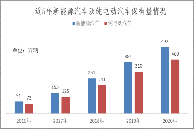 根據公安部交通管理局公布的數據顯示,截至2020年底,全國新能源汽車保有量達492萬輛,比2019年增加111萬輛,同比增長29.18%。其中,純電動汽車保有量為400萬輛,占新能源汽車總量的81.32%。