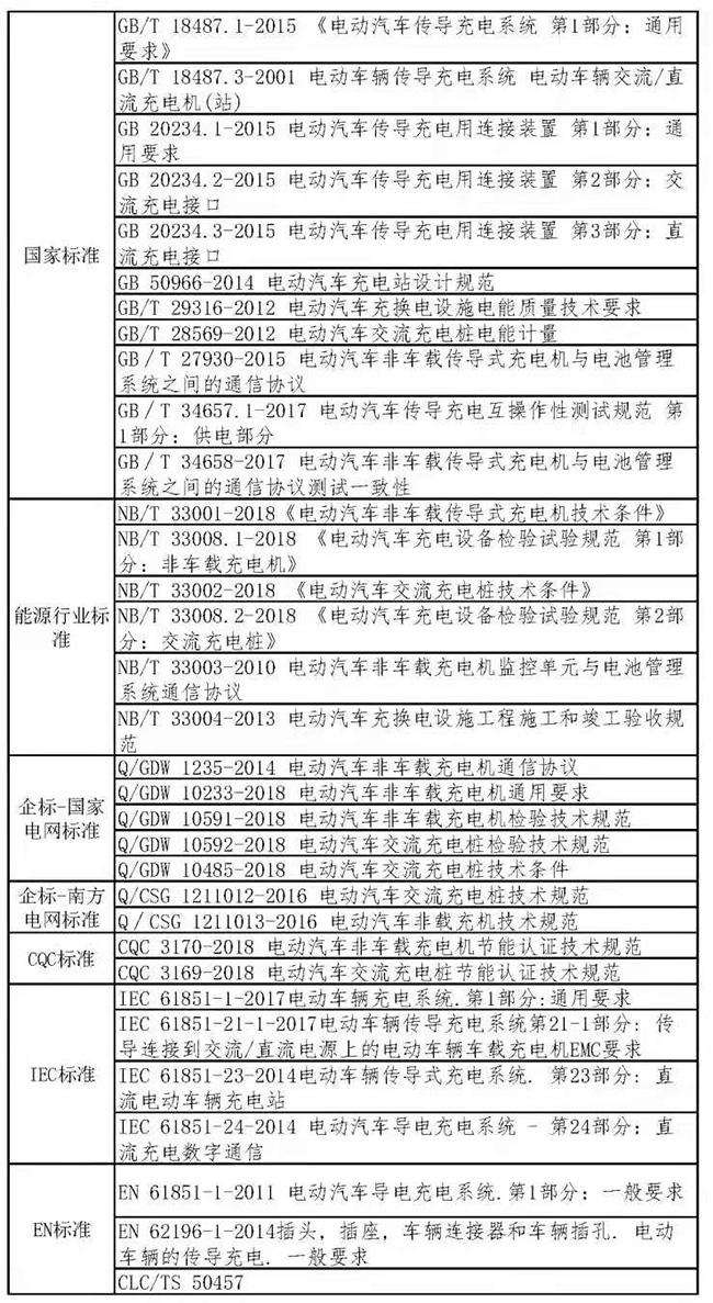 能源局標準主要規定了交/直流充電樁的充電功能、通訊功能、安全防護、電磁兼容等檢測方法與檢測要求,是目前市面上投入運營的充電樁必須過檢的權威標準;