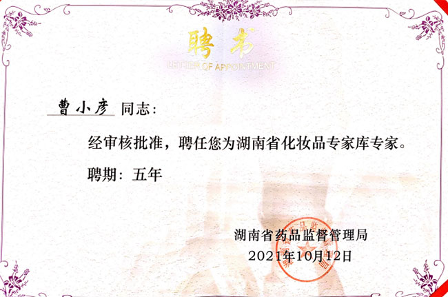 2021年12月2日,廣電計量食品與農產品檢測事業部總經理曹小彥被聘為湖南省市場監督管理局化妝品專家庫第一批入庫專家,成為檢驗檢測組14名專家之一。