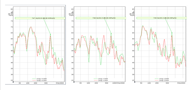 進(jìn)一步分析NTF(力聲傳遞函數(shù))可以看出空調(diào)管路三個(gè)方向的NTF在特征頻帶都有較高的峰值,如下圖: