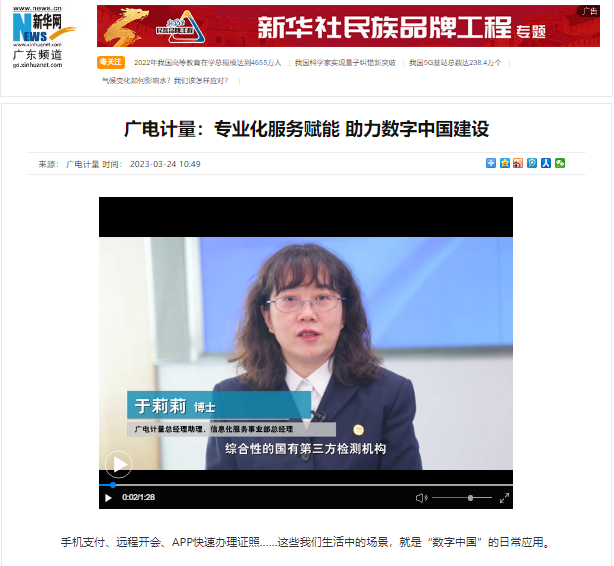日前,廣電計量總經理助理、信息化服務事業部總經理于莉莉博士受邀接受新華網廣東頻道采訪,暢談數字經濟新發展新機遇,并介紹公司在信息化檢驗檢測領域的技術能力與標準建設參與情況,以“全、專、高”的技術服務助力數字中國建設。