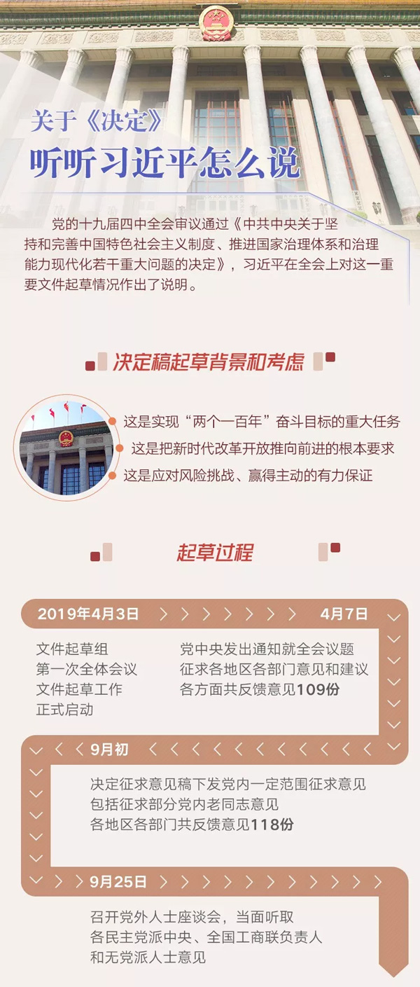 文件起草組成立6個多月來,認真研讀相關重要文獻,系統總結我國革命、建設、改革進程中的制度演變、制度創新,特別是深入總結黨的十八大以來黨中央領導全黨全國人民堅持和完善中國特色社會主義制度,推進國家治理體系和治理能力現代化取得的重大理論成果、實踐成果、制度成果,整理消化各方面反饋的意見和建議,開展專題研究,反復討論修改決定稿。