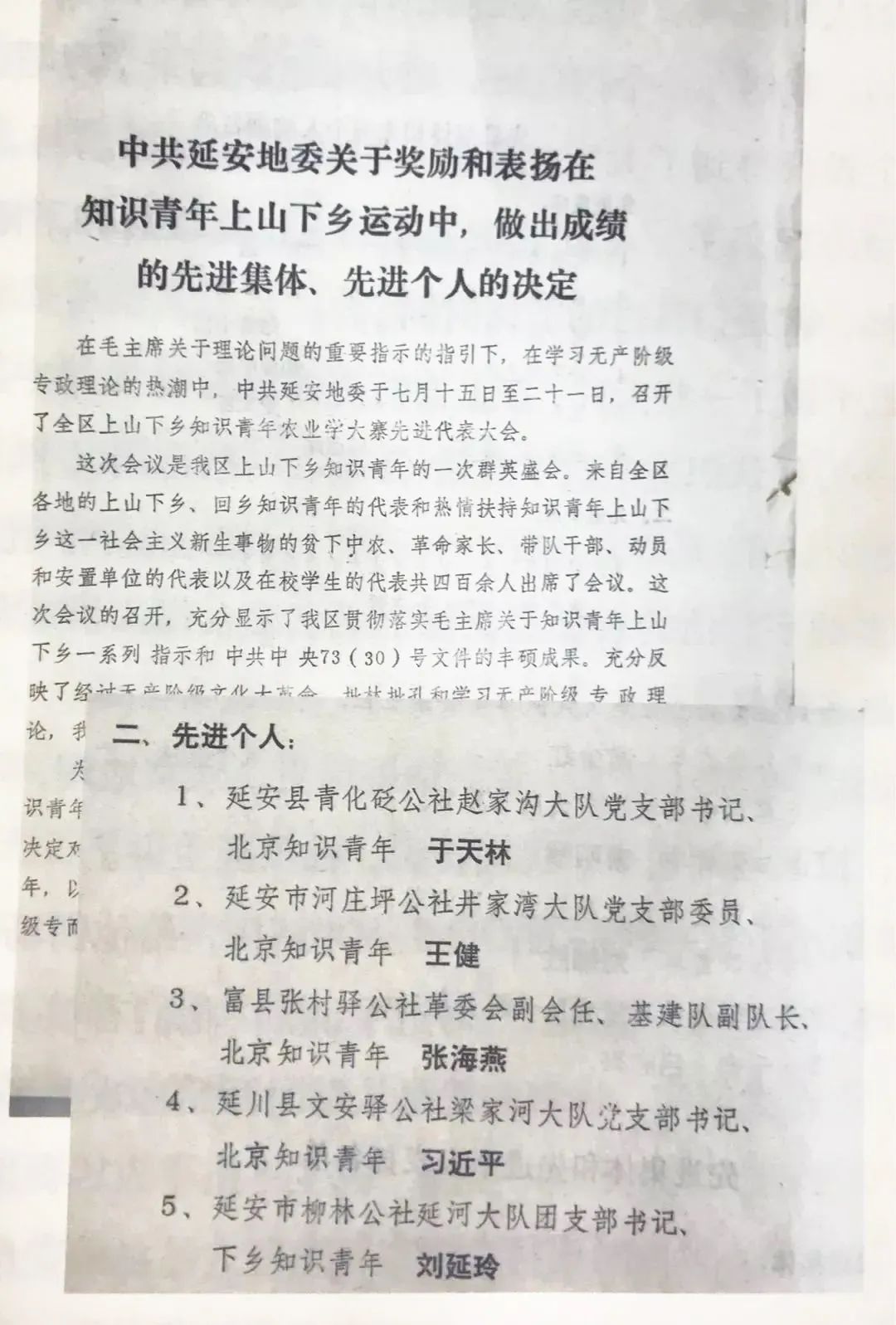 延安地委表彰上山下鄉(xiāng)運動中的先進集體和個人,其中就有時任梁家河大隊黨支部書記習(xí)近平。(來源:央廣網(wǎng))